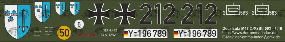 Decalsatz für einen M48 der 2.Kompanie des Panzerbataillons 563 aus Landshut mit vorbildgerechten Turm- und Y-Nummern.
